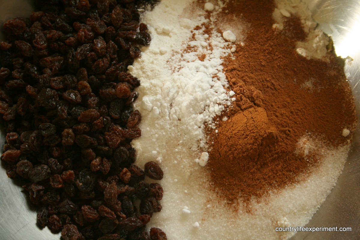 1. Place flour, sugar, cinnamon, mixed spice, baking powder, and bicarb soda in a bowl (you could sift it if you wanted – I rarely do).
